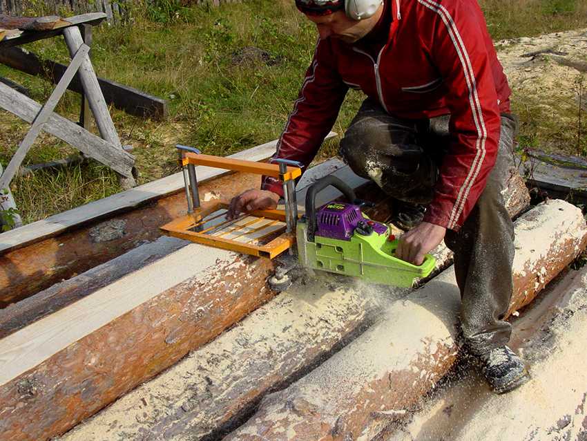 Возможность выставить точный размер и правильный раскрой бревна позволяют получить доски одинаковой толщины и снизить количество отходов. Для первого распила дерева необходима направляющая рама или ровная прямая доска. В качестве альтернативы можно создать ровную базовую поверхность с помощью топора, электрорубанка и уровня. При последующих распилах базовой поверхностью служит ровная сторона доски, полученная при предыдущем подходе.
