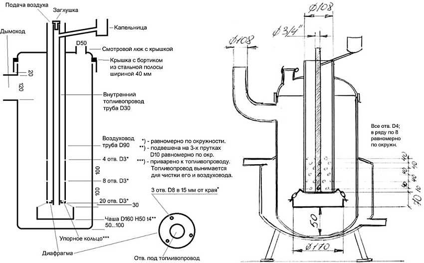 Печь на отработанном масле изготавливается из металла. Её конструкция представляет собой две, расположенные друг над другом ёмкости цилиндрической формы, соединённые трубой. Как и все типы печей, этот вариант оборудуется дымоходной трубой. В нижней ёмкости сгорает отработанное машинное масло. Выделяемые газы переходят по трубе в верхнюю ёмкость, где смешиваясь с воздухом, создают второй источник горения. Воздух поступает в верхнюю камеру через отверстия диаметром до 10 мм.