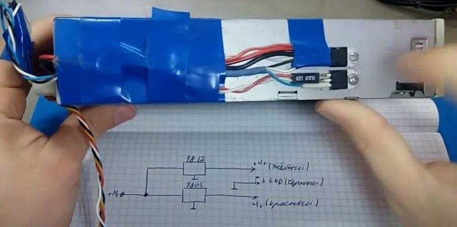 В модуляторе, который питается от прикуривателя, в разъёме питания скрыта микросхема стабилизатора. Разберите этот хвост, достаньте плату. Отпаиваем провод от плейера, крепим планку на это место экранированными проводами, а от планки кидаем такие же экранированные провода на любое место на микросхеме магнитолы, где есть 12 В. Чаще всего для этого используют как раз площадки, с которых мы раньше выпаивали реле лентопротяжки.
