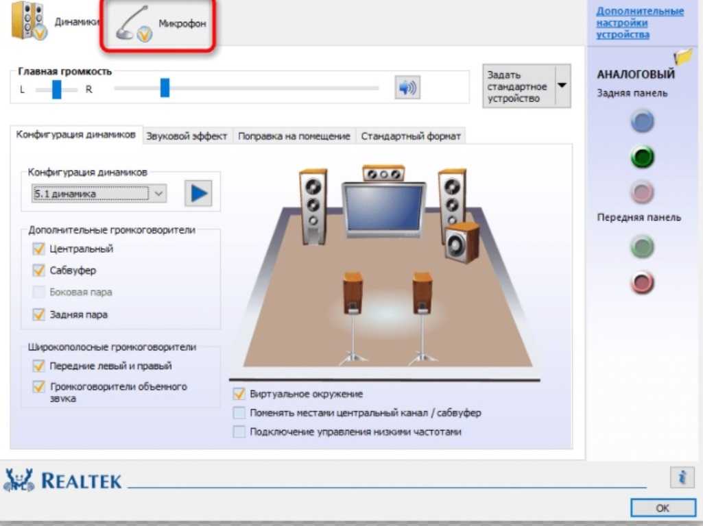 Во вкладке «Уровни» обратите внимание на ползунки: «Микрофон», «Лин. вход», «Side», «Center» (в зависимости от железа — их количество и названия у вас могут быть отличными от моего!)