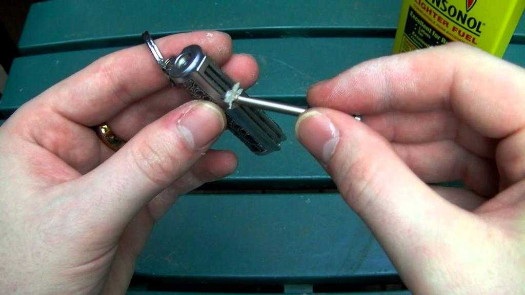 На помощь придет небольшой кусок асбестового волокна. Он не горит, но при этом легко пропитывается бензином. Если аккуратно удалить стандартный фитиль и заменить его асбестовым, то после того, как пары горючего испарятся, спичка просто погаснет. Достаточно будет окунуть её в ёмкость с бензином и можно снова зажигать – работоспособность ничуть не пострадает.